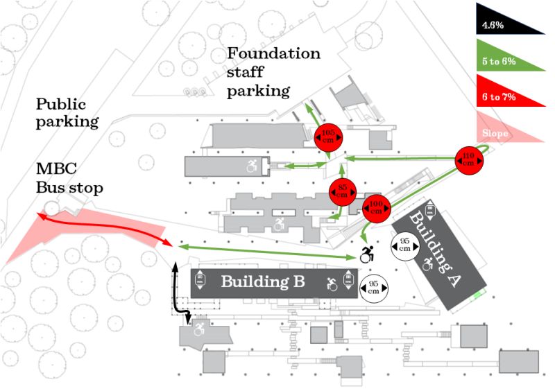 From the public parking lot, you can access the Foundation’s buildings via a concrete path with a maximum gradient of 7% for a slope that reaches 6% at its steepest. The path is never less than 350 cm wide and has several steps measuring 2.5 cm.